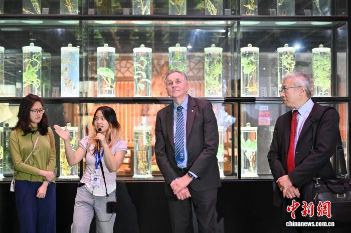 图为广州西医药年夜教的教死(左两)为巴里·马歇我(左两)引见广东西医药专物馆。中新社记者 旧楚白 摄